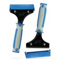 Possui lâmina com dois lados, um deles cortante, indicado para remoção de adesivos, tinta, fitas adesivas, etc., e outro não cortante para remoção de cimento e para serviços mais pesados, inclusive no trabalho em pisos e rodapés.• Pode ser acoplado aos cabos com ponteira cônica e às extensões telescópicas.• Fabricado em Zamac com lâmina em aço carbono que proporcionam excelente durabilidade.• Cabo anatômico muito durável, em polipropileno e fortipreme proporcionando maior conforto e segurança pois tornam a empunhadura mais firme e antiderrapante.