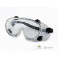 Óculos de proteção, modelo ampla-visão, constituído de armação confeccionada em uma única peça de plástico rígido recoberto internamente com borracha termoplástica macia, sistema de ventilação indireta composto de dezoito fendas, sendo dez na parte superior e oito na parte inferior da armação, ajuste através de tirante elástico preto com regulagem de tamanho encaixado nas laterais do visor por meio de presilhas plásticas que permitem a movimentação angular, visor confeccionado em policarbonato.