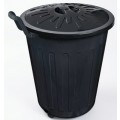 Cesto de lixo preto com capacidade para 100 litros, fabricado em plástico de alta resistência. Inclui tampa e rodas para facilitar a locomoção, sendo ideal para coleta seletiva e armazenamento de lixo em áreas internas ou externas.
